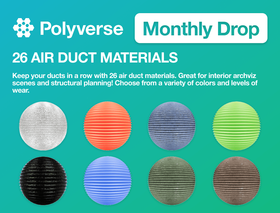 This month’s Polyverse drop adds a variety of air duct materials in multiple colors and wear states, perfect for games, VFX, and architectural visualization.